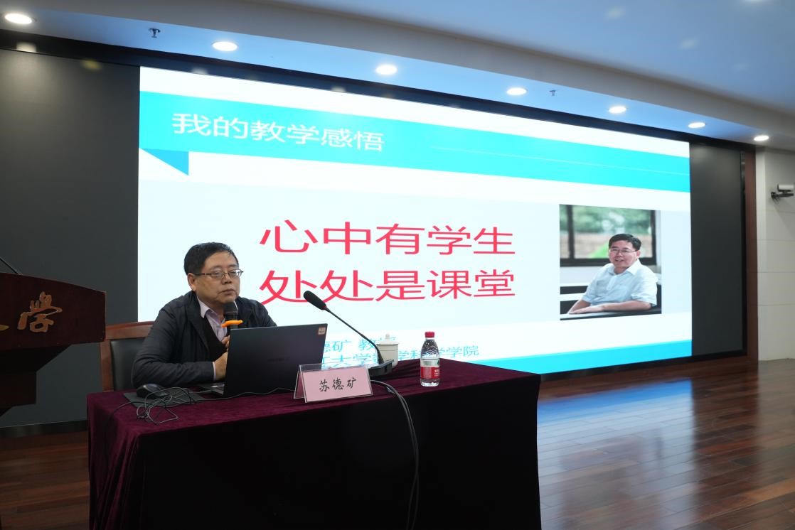 苏德矿教授结合其生动的教学实践,直面育人核心,系统阐释了如何让学生“听得懂、学得有趣、学得透、学得精”。他将毕生智慧凝练为“懂、透、精、趣、情、德”六字箴言,彰显了“育人”与“教学”并重的崇高追求。他强调,要在“听得懂”上下功夫,他强调教师应热爱教学、精心设计板书与逻辑推演,确保内容清晰易懂;要在“学得有趣”上用心,他说要善用生活比喻、课堂互动和时事热点,让微积分课堂生动而富有张力;要在“学得透”上求新,他建议要融合线上线下资源,构建“无边界课堂”,推行合作学习,并灵活运用AI工具辅助教学;要在“师生情意”与“品德培养”上用情,他总结要通过音乐、寄语、答疑等多种方式与学生建立深厚联结,使价值观教育自然融入教学全过程,实现知识传授与人格塑造的统一。